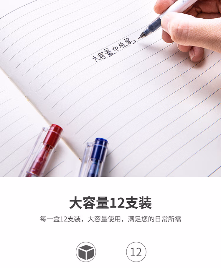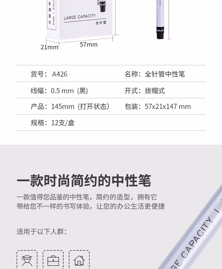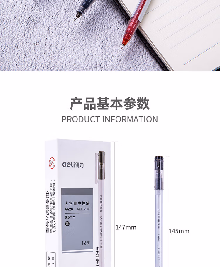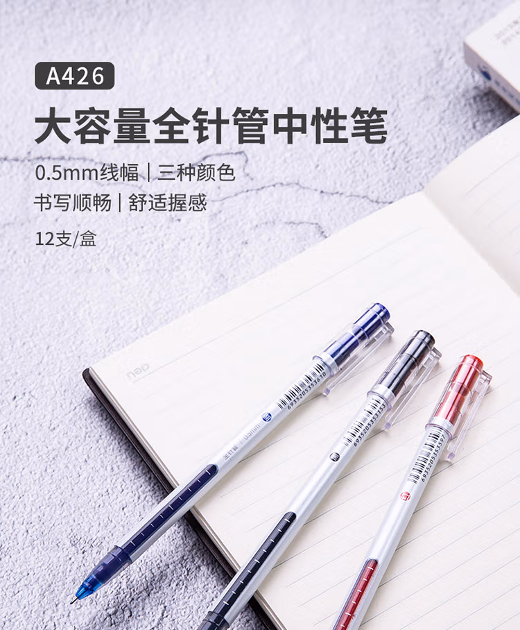 商品名称:得力(deli) A426巨能写中性笔大容量全针管耐用0.5mm 黑色 12支装