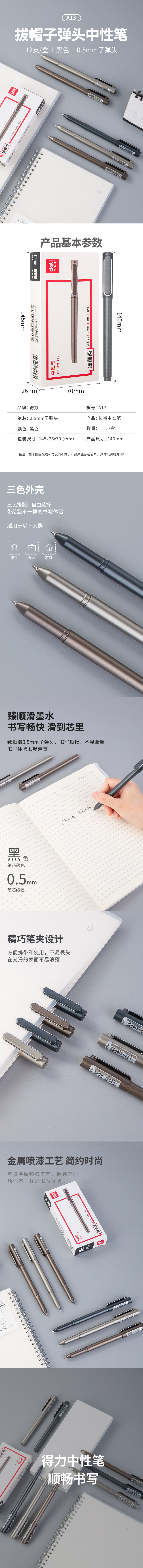 商品名称:得力(deli)乐素中性笔0.5mm学生用子弹头简约小清新可爱签字笔书写工具 拔盖黑色 12支/盒