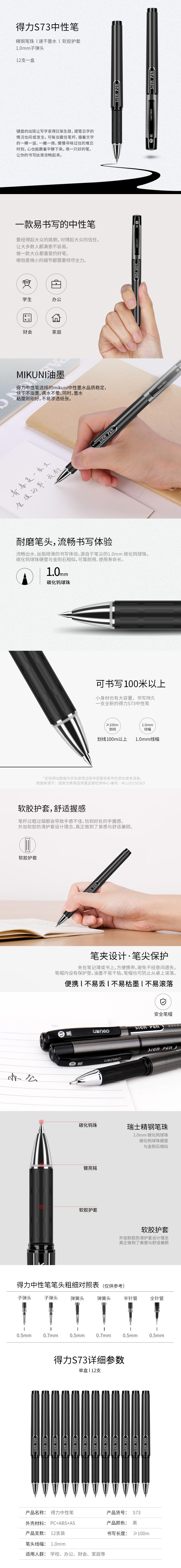 商品名称:得力(deli) 1.0mm加粗中性笔水笔碳素水笔签字笔 办公学生文具S73 黑色 12支/盒