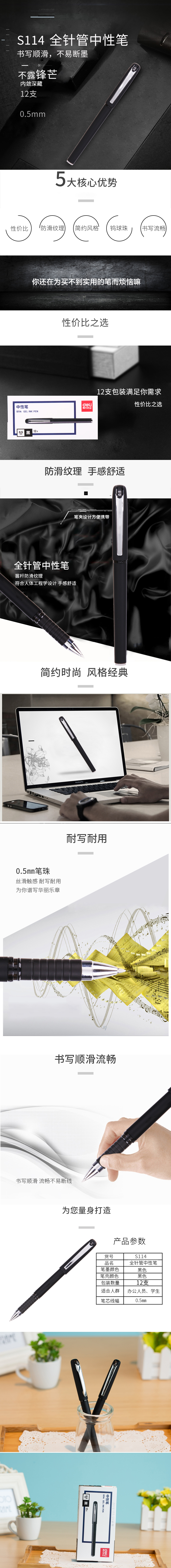 得力(deli) s114中性笔黑色水性笔 0.5mm磨砂杆商务签字笔碳素笔 办公用笔12支/盒 黑色