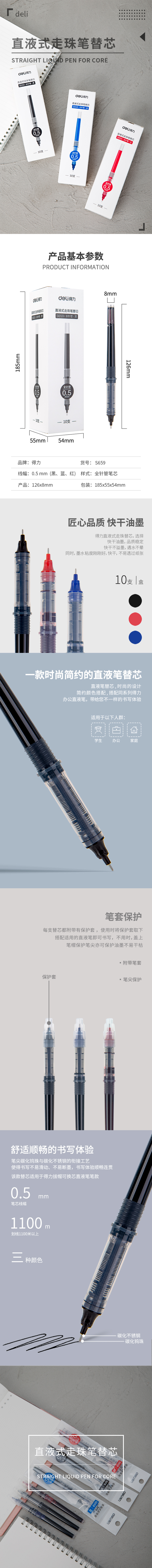 商品名称:得力(deli)全针管直液式走珠笔替芯0.5mm学生考试中性笔办公用速干签字笔替换芯可换墨囊 直液式走珠笔替芯/10支装 S659