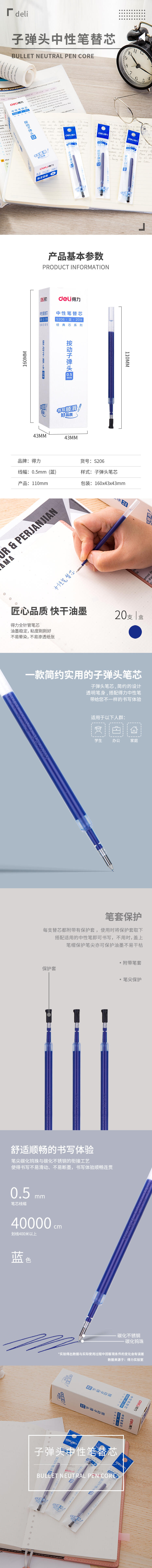 商品名称:得力(deli)考试笔0.5mm按动中性笔办公签字笔子弹头碳素水笔替芯 办公用品 蓝色0.5mm 20支S206