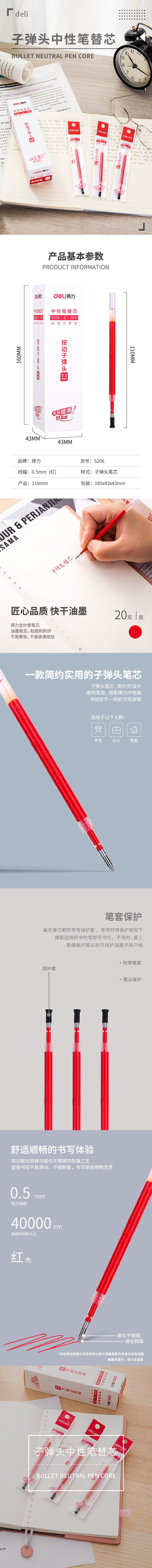 得力(deli)0.5mm按动中性笔芯替芯 S01 K35用 红色子弹头20支/盒 办公用品 S206