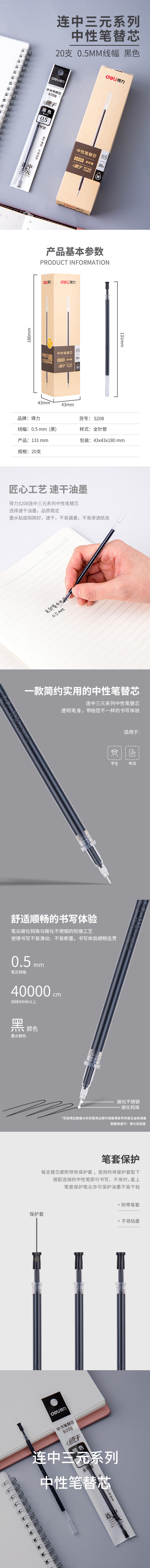 商品名称:得力(deli)连中三元速干考试中性笔替芯 全针管碳黑笔芯20支/盒DL-S208