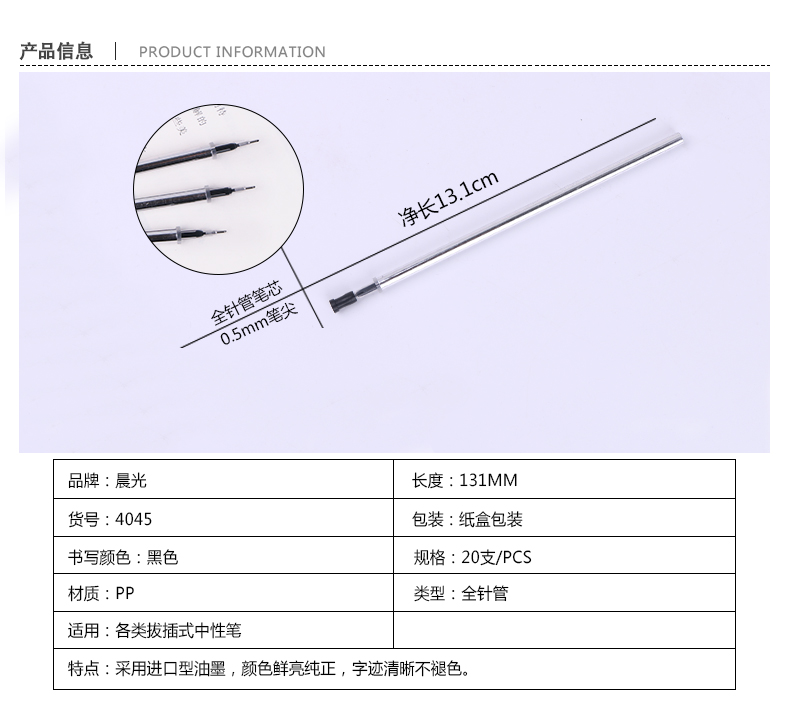 商品名称:晨光(M&G)4045中性笔笔芯黑0.5mm全针管子弹头水笔优品学生考试笔芯 (20支/盒)