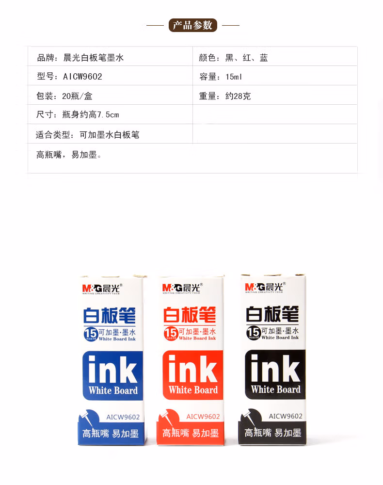 商品名称:晨光(M&G)AICW9602白板笔墨水补充液记号笔水性记号笔墨水 黑色/红色/蓝色 15ml/瓶
