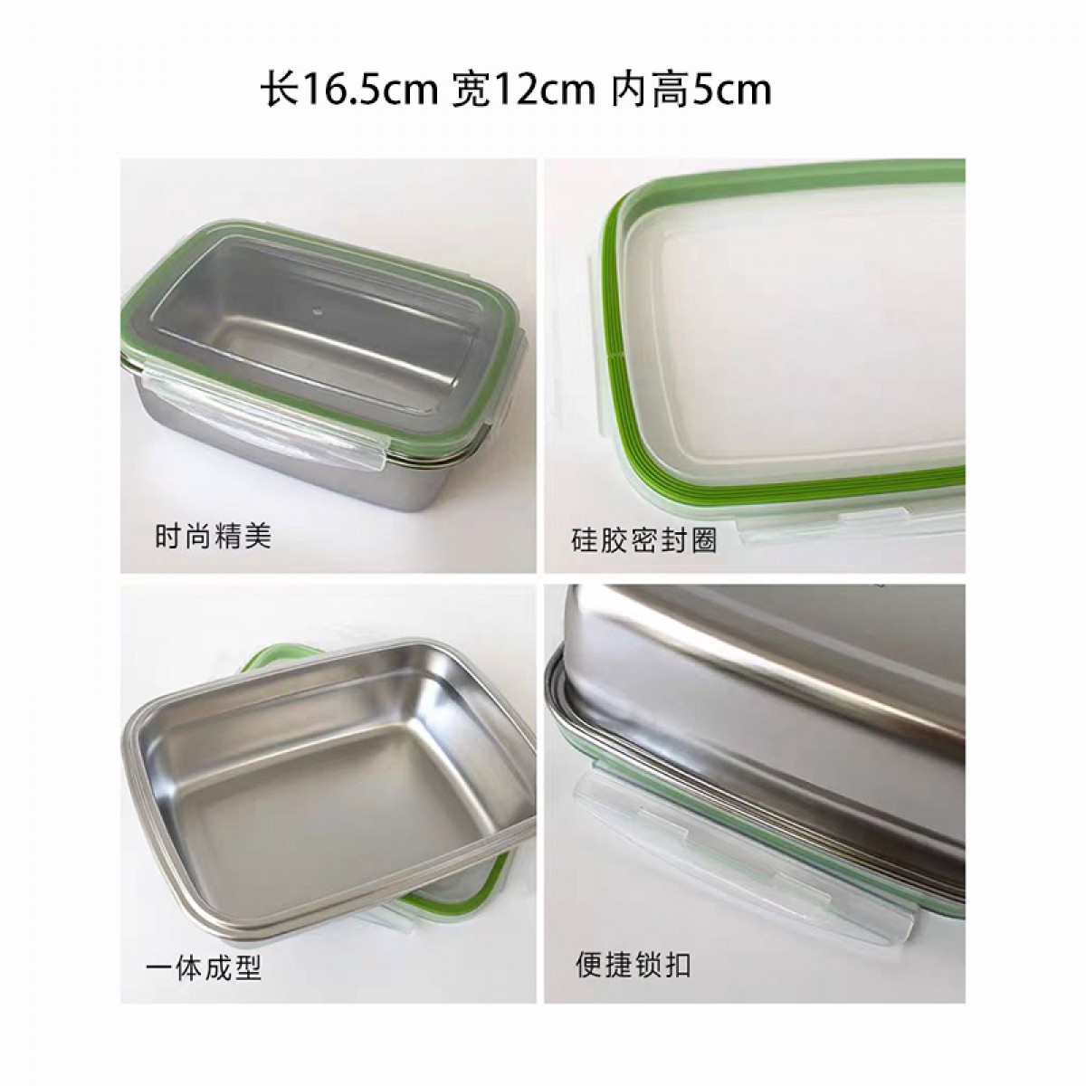 商品名称:304不锈钢长方形保鲜盒饭盒带盖防漏密封 长16.5*宽12*内高5cm 塑料盖 【56】