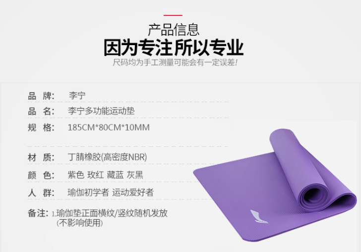 商品名称:李宁 LBDM794 运动健身垫瑜伽垫 1850*800*10mm 紫/蓝/灰/玫红 【66】