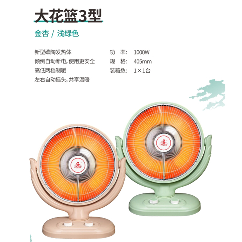 商品名称:小霸王 大花篮3型 花篮式电暖气 1000W 405mm 倾倒自动断电 左右自动摇头 金杏/浅绿【144】