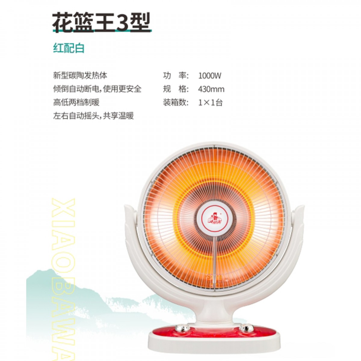 小霸王 花篮王3型 花篮式电暖气 1000W 430mm 倾倒自动断电 左右自动摇头【145】