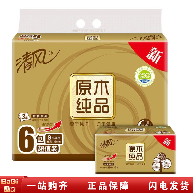 商品名称:清风 BR65SJ金装原木纯品3层130抽取式面巾6包装纸餐巾纸8提/件