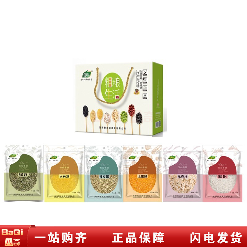 商品名称:升美滋粗粮生活2640克杂粮礼盒尺寸35*13*23cm(500克绿豆、460克玉米渣、460克大黄米、460克荞麦米、300克燕麦片、460克糯米)