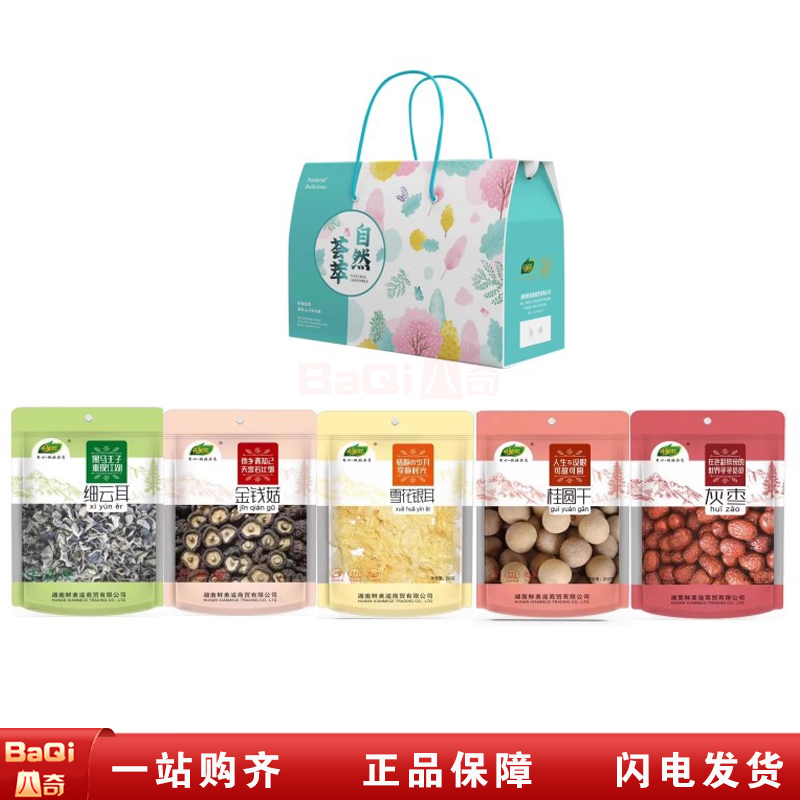 商品名称:升美滋660克自然荟萃礼盒尺寸43*19*30cm(100克细云耳、100克金钱菇、200克桂圆干、200克灰枣、60克雪花银耳)