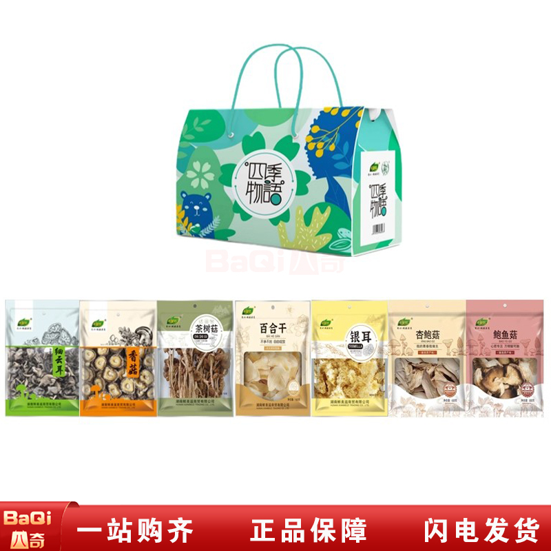 商品名称:升美滋四季物语876克礼盒尺寸44*21*32cm(68克杏鲍菇、88克鲍鱼菇、150克茶树菇、150克百合干、120克银耳、150克香菇、150克细云耳)