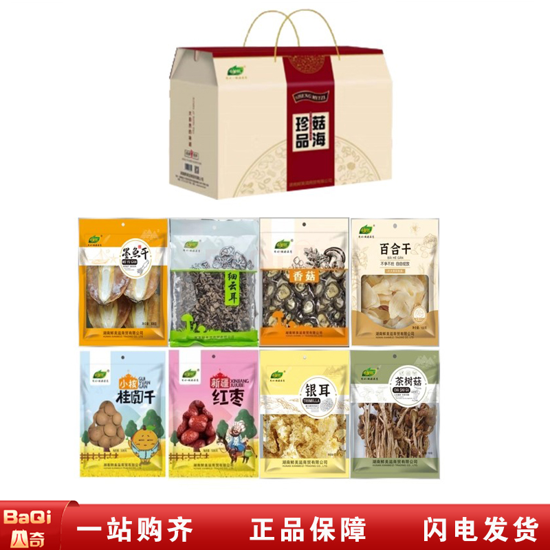 商品名称:升美滋菇海珍品2028克礼盒尺寸44*21*32cm(308克墨鱼干、150克细云耳、150克香菇、150克百合干、500克小核桂圆干、500克新疆红枣、120克银耳、150克茶树菇)