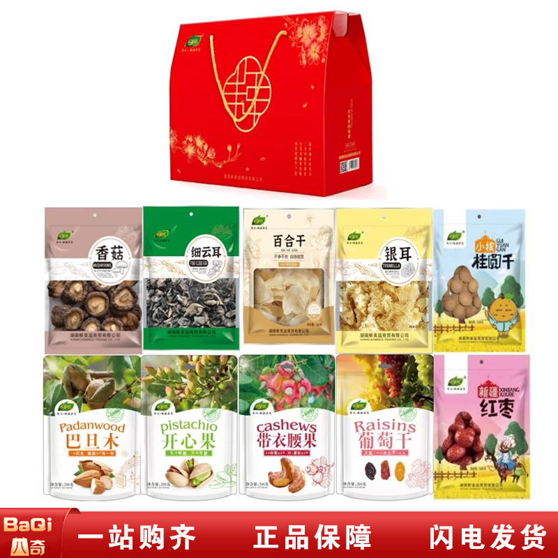 商品名称:升美滋丰年2678克尺寸50*23*33cm(258克香菇、258克细云耳、150克百合干、120克银耳、500克小核桂圆干、208克巴旦木、208克开心果、208克带衣腰果、268克葡萄干、500克新疆红枣)