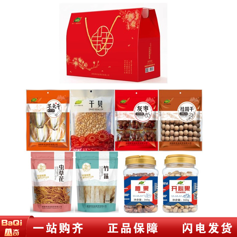 商品名称:升美滋丰年2564克礼盒尺寸50*23*33cm(500克墨鱼干、200克干贝、500克灰枣、500克桂圆干、36克竹荪、108克虫草花、360克腰果、360克开心果)