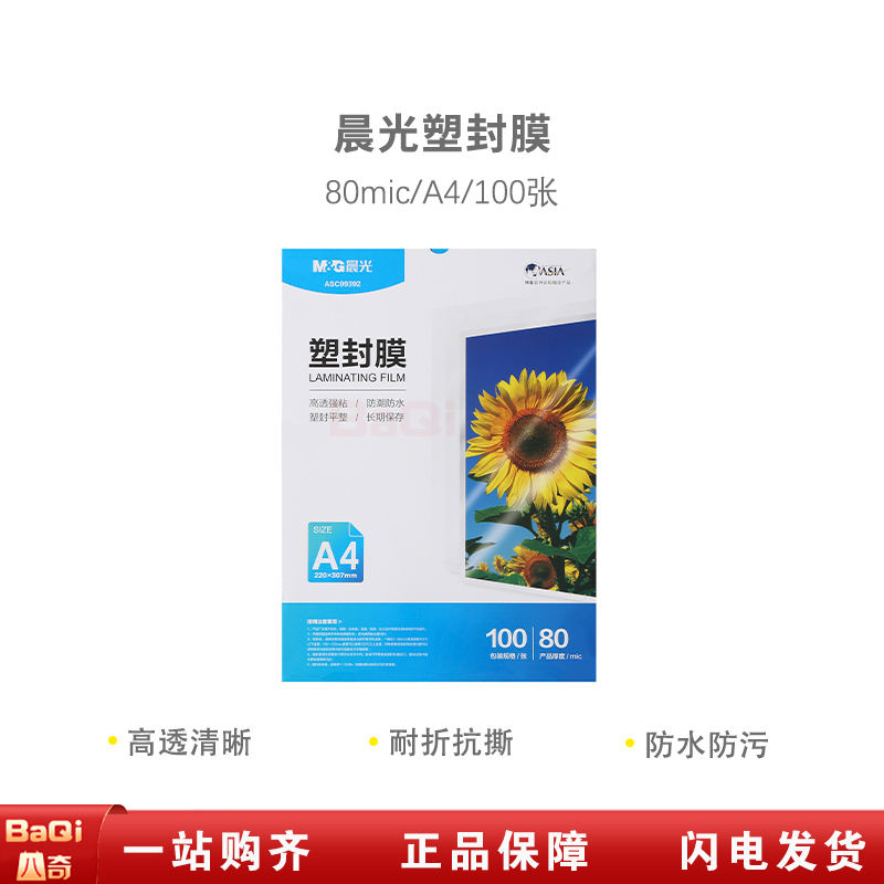 商品名称:晨光ASC99392过塑机A4塑封膜80mic(100张/包)