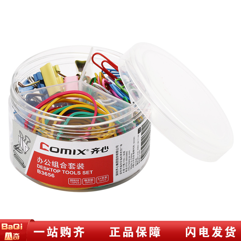 商品名称:齐心 B3656 办公组合套装 5号票夹/29mm回形针/橡皮筋