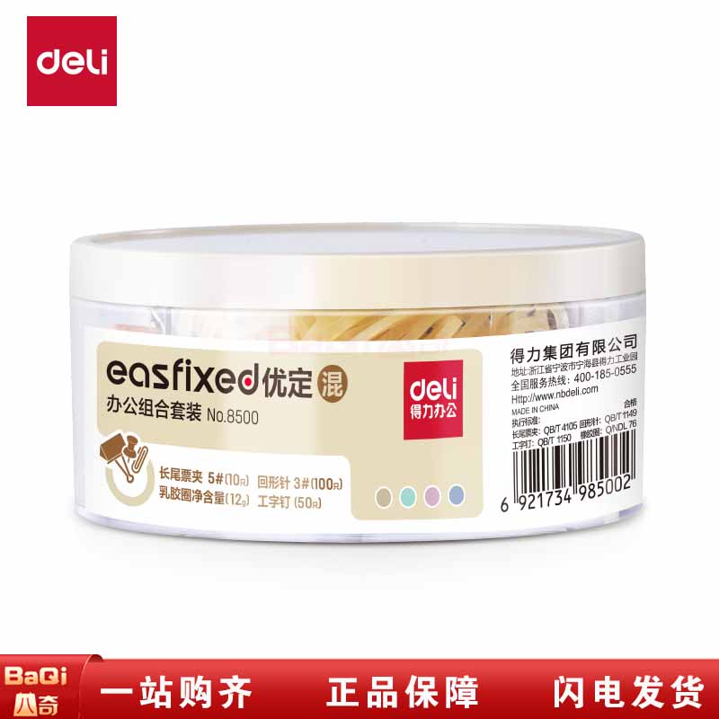 商品名称:得力8500办公组合套装彩色办公用品工字钉票夹回形针橡胶圈橡皮筋