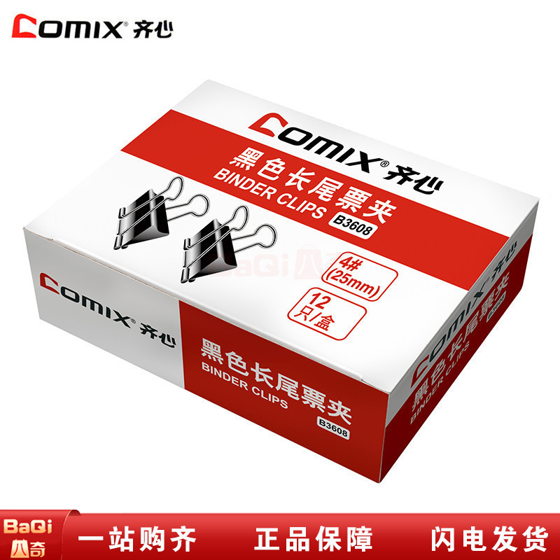 商品名称:齐心 B3608 黑色长尾票夹 4# 25mm 12只/盒黑