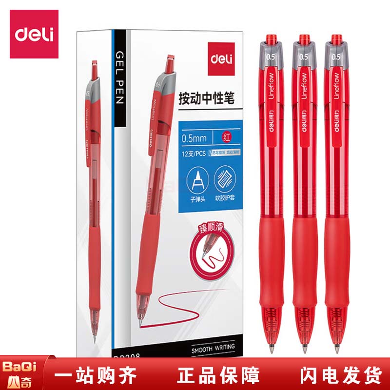 商品名称:得力 DP208 臻顺滑办公中性笔0.5mm弹簧头 红色 12支/盒