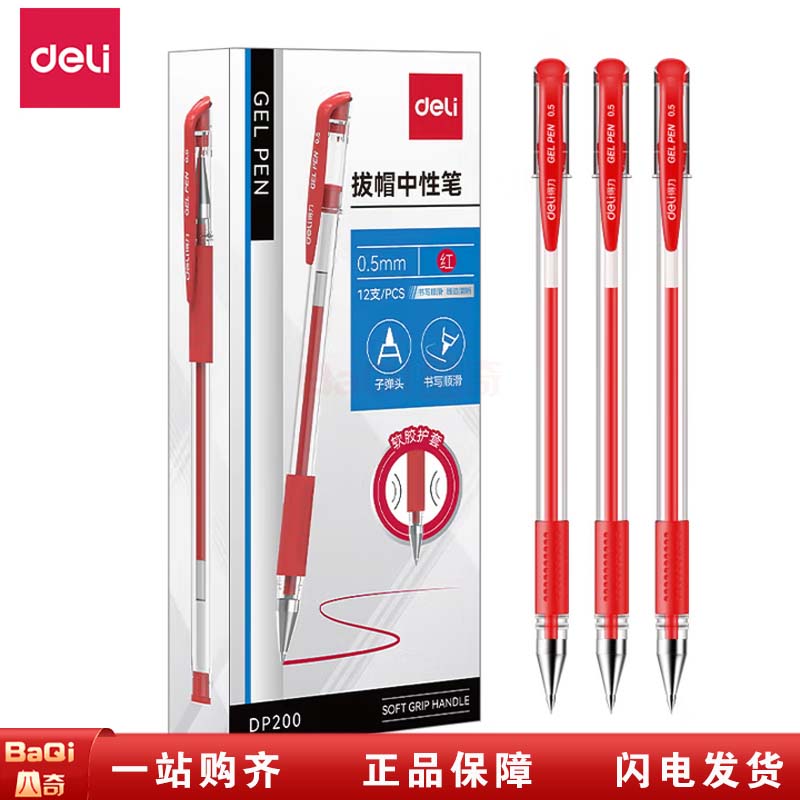 商品名称:得力 DP200 拔帽中性笔0.5mm子弹头 红色 12支/盒