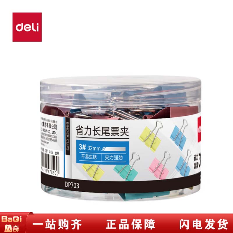 商品名称:得力 DP703省力长尾票夹3#夹宽32MM 混色 24个/筒