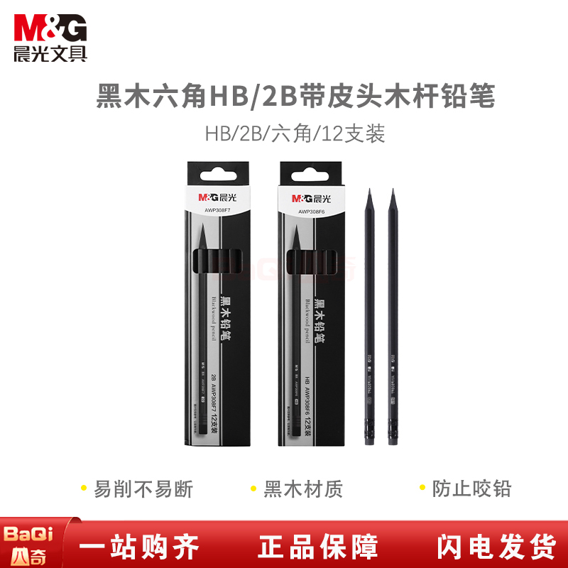 商品名称:晨光AWP308F7 黑木六角HB带皮头木杆铅笔(12支/盒)