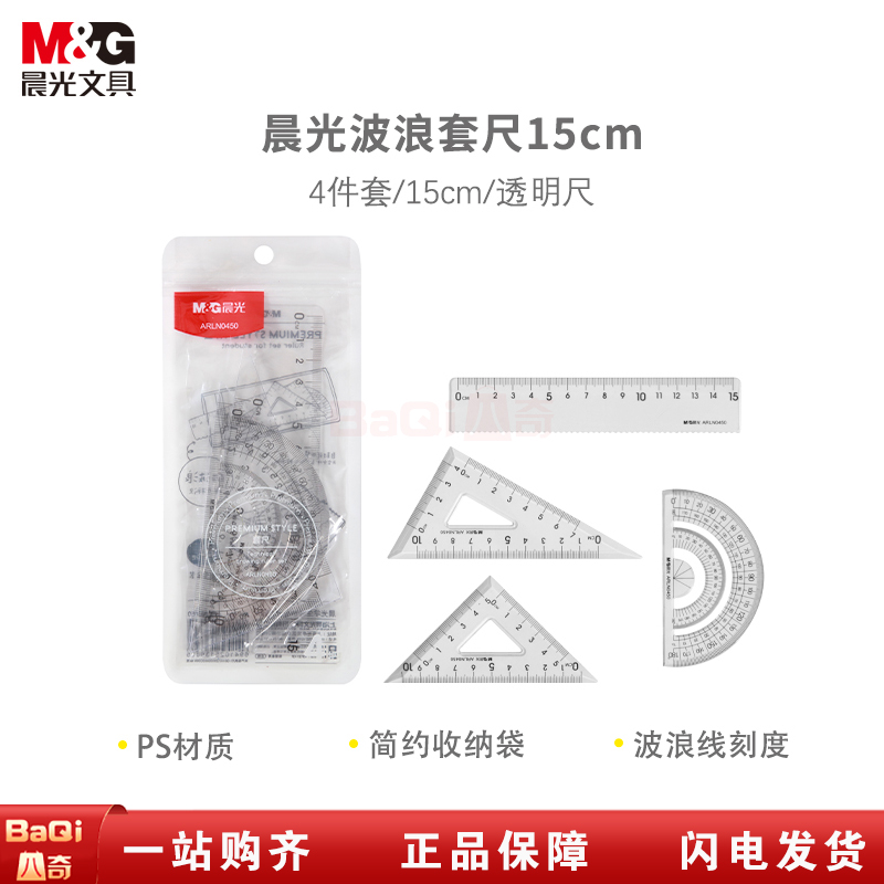 商品名称:晨光ARLN0450 学生考试绘图套尺 15cm直尺+三角尺*2+量角器 (4把/套)