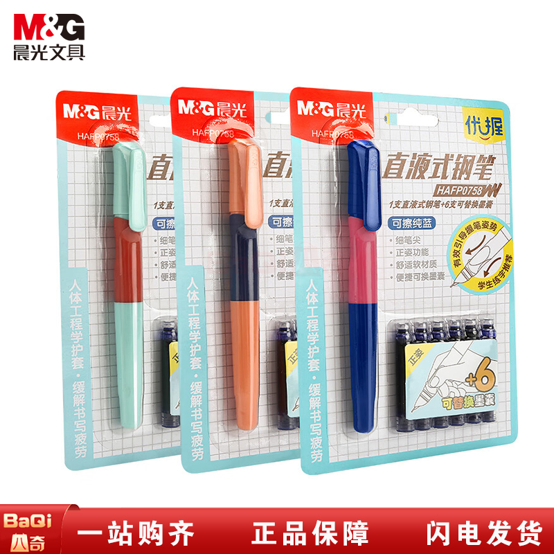 商品名称:晨光HAFP0758 优握直液式学生纠正握姿练字可换墨囊书法钢笔 晶蓝色 单卡装