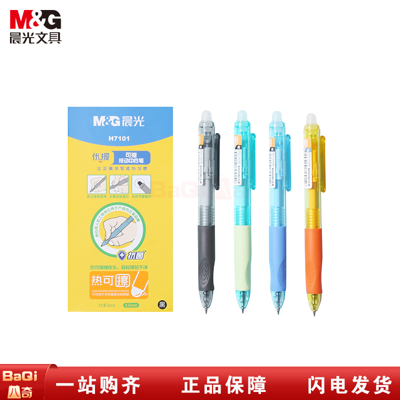 商品名称:晨光AKPH7101 优握热可擦笔3-5年级中性笔易擦按动式可擦水笔0.5mm可爱卡通学生用笔 黑色/晶蓝色(12支/盒)