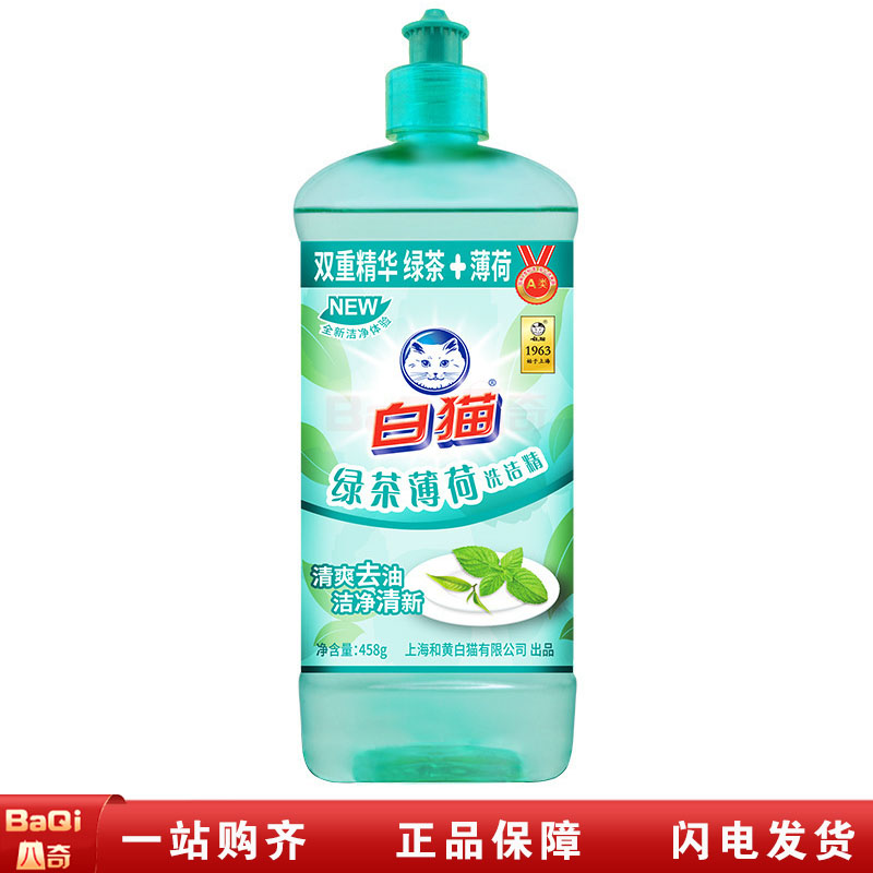 白猫/whitecat 绿茶薄荷洗洁精458g 洗洁精 绿茶薄荷洗洁精清爽去油洁净清新餐具净蔬果净458g/瓶