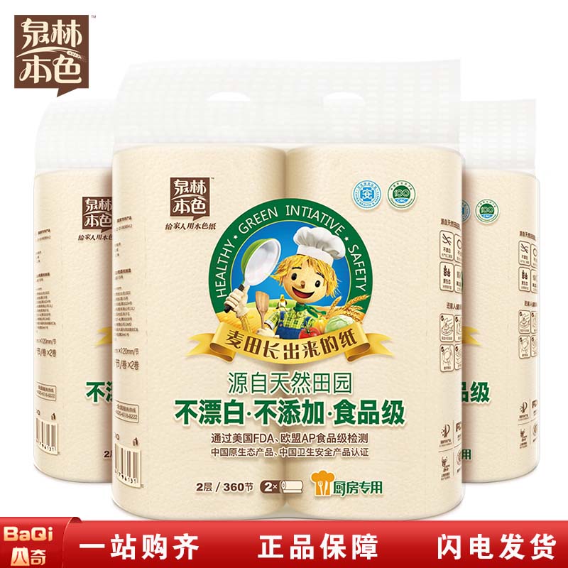商品名称:泉林本色 2层厨房用纸180节2卷吸油吸水卷纸家用不漂白纸巾加厚擦手纸