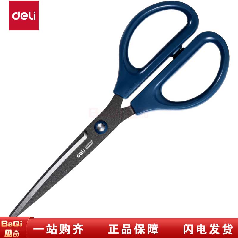 商品名称:得力0604-F蓝色家用办公剪刀防粘设计黑柄不锈钢裁纸刀手工文具