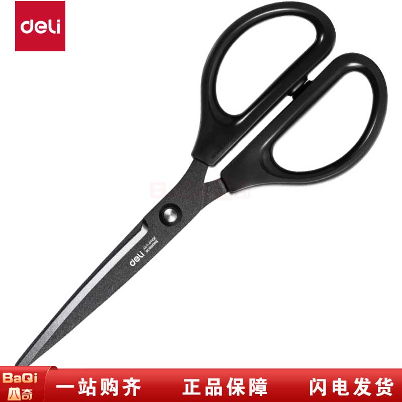 商品名称:得力0604-F黑色家用办公剪刀防粘设计黑柄不锈钢裁纸刀手工文具