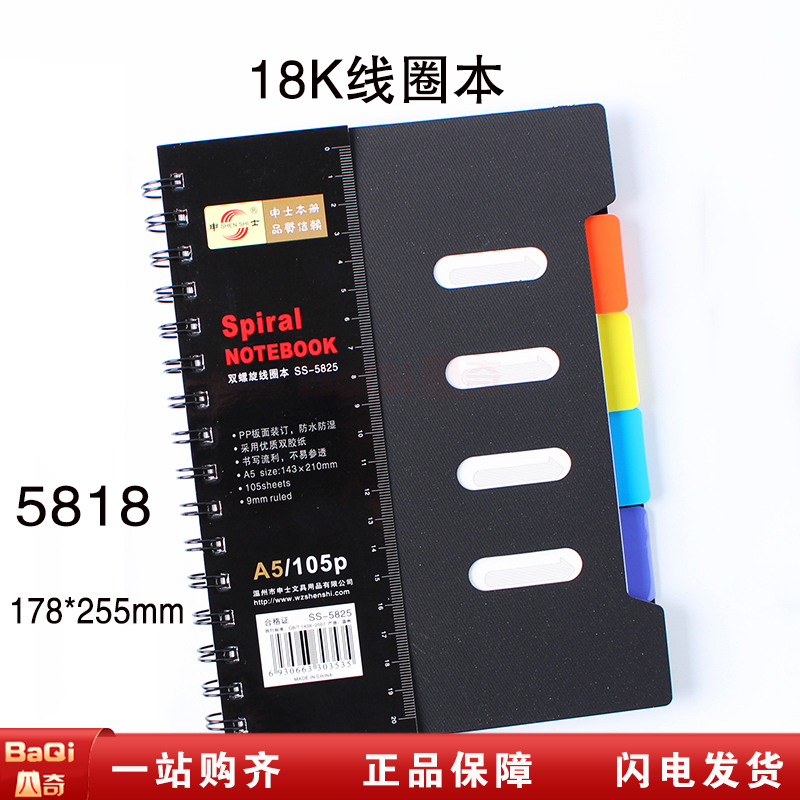 商品名称:申士 5818 18K线圈本笔记本记事本58分类系列(PP料)70克白纸105页 黑色 178*255mm(96本/箱)