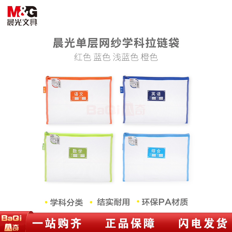 商品名称:晨光ADM929SQ 学科科目分类A4文件袋透明网纱拉链式单层书袋学生作业试卷资料收纳袋 数学/语文/英语/综合/作业