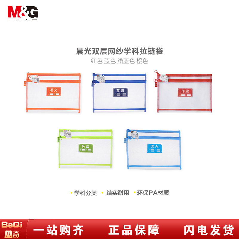 商品名称:晨光ADM929SR 学科科目分类A4文件袋透明网纱拉链式双层书袋套装 学生作业试卷资料收纳袋 (4个/套)
