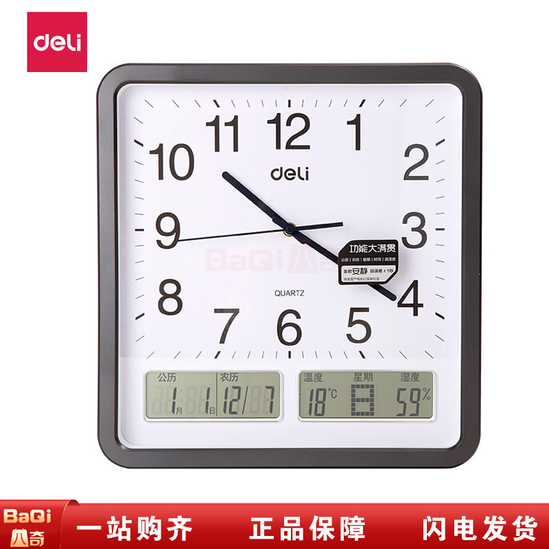 商品名称:得力 8823 农历公历温湿度钟表挂钟客厅方形创意时钟